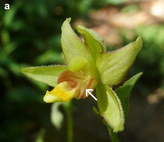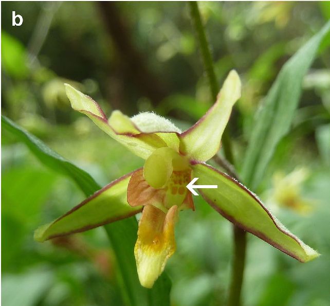 Another Angle Fig. 1 Epipactis flava. a Flower in lateral front view displaying nectar in the hypochile (arrow). b Flower in upper front view displaying orange warts and calli in the hypochile (arrow) and a drop-shaped callus on the epichile. Photographs: K. Srimuang (Thee Lo Su waterfall, January 2011) Photos © by K. Srimuang and The Pollination-system diversity in Epipactis (Orchidaceae): new insights from studies of E. flava in Thailand Website