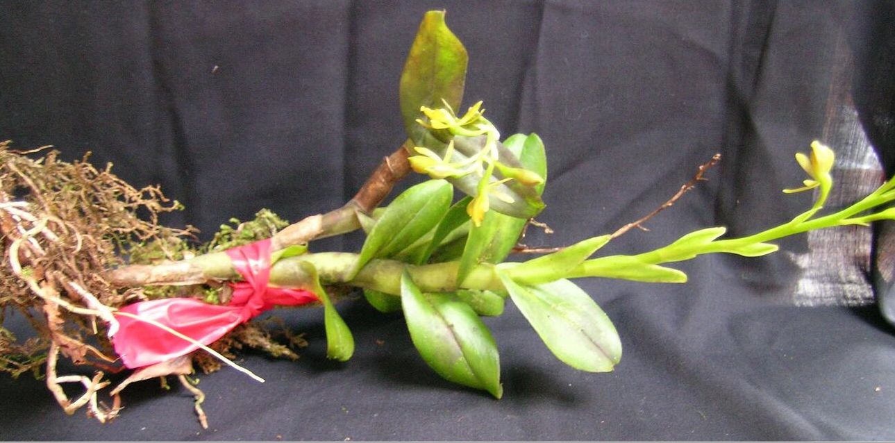 Found in Huanuco department of Peru on the eastern slopes of the Andes as a small sized epiphyte with arcuate, branched stems enveloped mostly by loose, tubular to infundibular leaf sheaths and carrying several to numerous, distichous, spreading, oblong-elliptic, acute leaves that blooms on a short, erect, racemose, to 1.6" [4 cm] long, loosely several flowered inflorescence with lanceolate, spreading, longer than the ovary floral bracts.