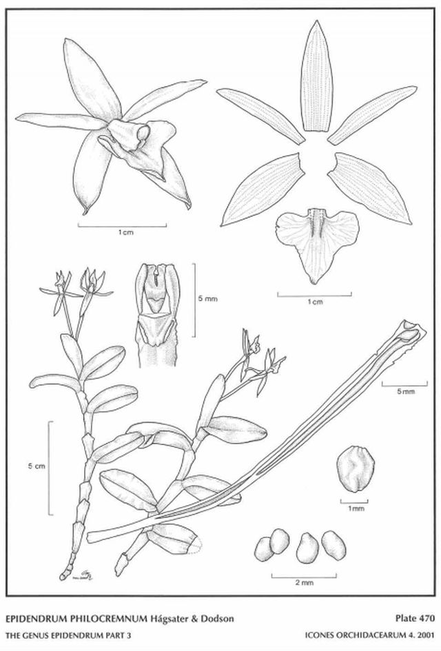 "Epidendrum philocremnum belongs to GROUP Geminiflorum , recognized by the prominent, rounded spathe, few, non-resupinate flowers, the lip non-excavate. The species is recognized by the two flowers, sepals .48 to .6" [12 to 15 mm] long, and prominent, suborbicular lateral lobes of the lip. Epidendrum geminiflorum Kunth has 2 to 4 larger flowers, sepals .6 to .8" [15 to 20 mm] long, acuminate sepals, petals and the lip with incipient, rounded lateral lobes. Epidendrum stevensonii Hágsater & Dodson has 5 to 10 simultaneous flowers, with .72" [18 mm] long sepals, a spade-like lip without lateral lobes and is always epiphytic. Epidendrum rotundifolium Hágsater & Dodson has suborbicular to elliptic leaves, sepals .6" [15 mm] long and very narrow petals, the lip is excavated, Malaxis-like; it is restricted to the lower mountains at the foot of the western Andes on the border between Ecuador and Peru. Epidendrum cuencanum Schltr. has a triangular-subcordate, acuminate lip, sepals .8" [20 mm] long, and petals linear, .04" [1 mm] wide." Hagsater etal 2001