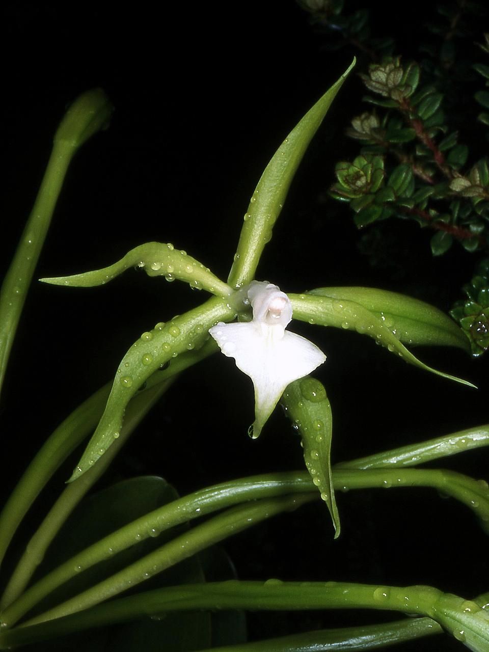 Found in Ecuador on the eastern slopes of the Andes on cliffs and steep hillsides at elevations of 1600 to 2200 meters as a small sized, cool to cold growing lithophye or terrestrial with simple, cane-like, laterally flattened, ancipitous, somewhat flexuous stems carrying 3 to 7, throughout the upper 2/3's of the stem, ovate to narrowly ellipitc, bilobed, subcoriaceous leaves that blooms in the later winter on a terminal, arising through a conduplicate, semi-obovate, rounded spathe enveloping the racemose, 2 flowered inflorescence and has much shorter than the ovary, narrowly triangular, acuminate floral bracts and carrying simultaneously opening, non-resupinate flowers.
