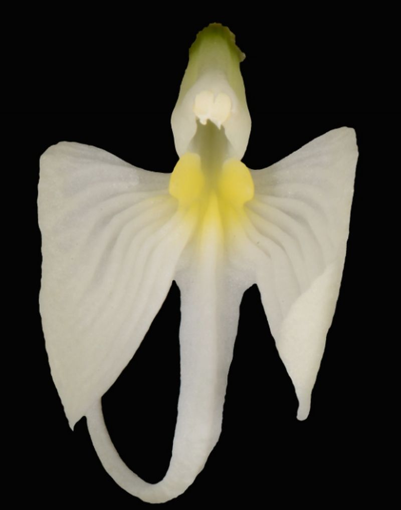 Found in Pastaza and Morona Santiago provinces of Ecuador at elevations of 900 to 2000 meters as a mini-miniature to miniature sized, warm to cool growing epiphyte with simple, cane-like, laterally compressed above but not ancipitose, terete at base, straight stem carrying 5 to 6, distributed along the apical half of stem, articulate, very unequal, progressively larger; foliar sheaths striated, laterally compressed, blade elliptic, obtuse, apex retuse, sub-coriaceous, slightly dorsally carinate, light to dark green on both sides leaves that blooms in the summer and fall on a terminal, without a spathe, peduncle very short, rachis short, racemose, producing new racemes in subsequent years, and becoming pluri-racemose over time, successivly single, few flowered inflorescence with much shorter than the ovary, triangular, acute, clasping floral bracts and carrying resupinate flowers without fragrance data.