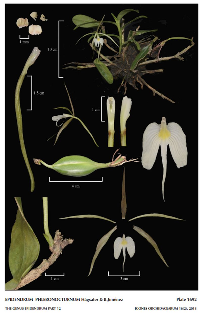 "Epidendrum phlebonocturnum is part of GROUP Nocturnum which is characterized by the sympodial, caespitose plants, short, racemose or pluri-racemose infloresce nce, without spathaceous bracts, usually large, star-shaped flowers, with similar sepals and petals, and the SUBGROUP Nocturnum which has cane-like stems, non-thickened towards the middle, and usually successive flowers; the flowers are mostly indistinguishable in shape. The species is recognized by the epiphytic habit, short stems .36 to .44" [9 to 11 cm] long, laterally compressed, bright green, 5 to 6 unequal leaves, ovary about as long as the .168 to .184" [42 to 46 mm] long sepals, deeply 3-lobed lip, with large yellow calli, and the lateral lobes with prominently raised veins radiating from the base and sub-parallel, the mid-lobe .92 x 1" [23 x 2.5 mm], i.e. 10:1 (length:width). Epidendrum porphyreonocturnum Hágsater & R.Jiménez has stems 6.4 to 16" [16 to 40 cm] tall, 3 to 8 narrowly elliptic, acute leaves of similar size, 2.6 x .4" [6.5 x-1.8 cm], dark green above, purple on the underside, ovary .172" [43 mm] long, sepals .72 to .84" [18 to 21 mm] long, lip .48 to .56" x .48 to .56" [12 to 14 x 12 to 14 mm], the lateral lobes ovate, with 6 thickened, radiating veins, mid-lobe .348 to ,36" x .8" [8.7 to 9.0 x 2.0 mm], i.e. 4:1 (length:width). Epidendrum minus (Cogn.) Hágsater has stems 4 to 8" [10 to 20 cm] long, leaves 2 to 3" x .32 to .56" [5.0 to 7.5 x 0.8 to 1.4 cm], 5:1, green on both sides, ovary .12" [30 mm] long, sepals .84 to .96" x 1.6" [21 to 24 x 4.0 cm} (Cogniaux 1907), it is found at lower altitudes in the Amazon basin." Hagsater etal 2018