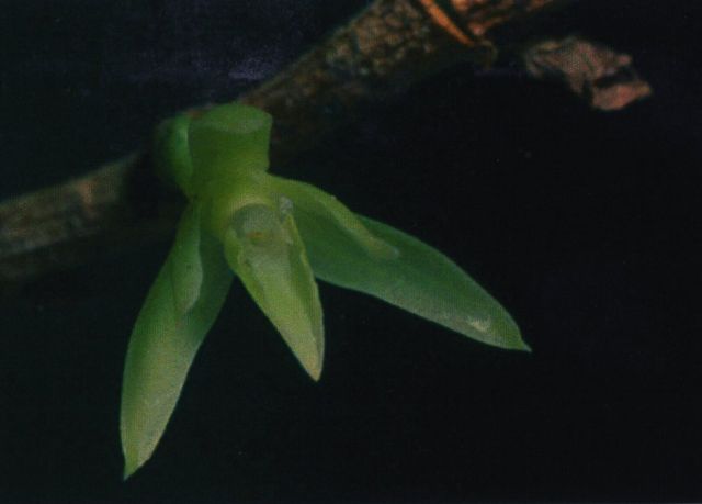 Found in southern Colombia on the western slopes of the Cordillera Occidental at elevations around 800 meters as a small sized, warm growing epiphyte with cane-like, simple, terete, straight stems enveloped by non-foliar tubular sheaths and carrying numerous, all along the stem, articulate, suberect-spreading, unequal in size, the basal and apical leaves are smaller than the median, ovate-elliptic to lanceolate, obtuse, bilobed, coriaceous leaves that blooms in the later summer on a lateral, arising from the base of the internodes through the foliar sheaths, subsessile, peduncle very short, totally hidden within the 2 to 3 short, imbricating bracts, single flowered inflorescence with shorter than the ovary, tubular floral bracts and carrying a green flower.