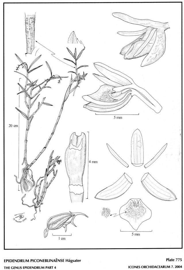 "Epidendrum piconeblinaense belongs to the GROUP Elleanthoides SUBGROUP Rhombochilum , characterized by the many branching thin canes, with long, narrow, grass-like leaves, the paniculate inflorescence with hair-thin peduncles, small flowers, oblong petals and a fleshy lip which embraces the column. The new species is recognized by the tree-like architecture, with a sturdy main stem and short branches, intermediate-sized flowers, oblong sepals .22 to .28" [5.5 to 6.1 mm] long, the linear-oblong petals 10: 1 in length/width, and a rhombic lip. It is similar to Epidendrum elleanthoides which has very small fiowers, sepals .148 to .172" [3.7 to 4.8 mm] long, with the sides of the transversely elliptic to trullate, apiculate, lip embracing the column without overlapping and the oblong petals about six times longer than broad. Epidendrum guacamayense has flowers nearly twice as large, the segments narrower and the petals about 15 times longer than broad, and the lobes of the lip overlapping above the column. Epidendrum saccatum Hágsater has shorter leaves, and a very broad, reniform lip with a sac-like base and without any ornamentation. Epidendrum montispichinchense Hágsater & Dodson has leaves about twice as wide and larger flowers, with the nectary forming a wide, rounded cavity." Hagsater etal 2004