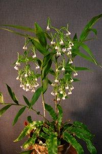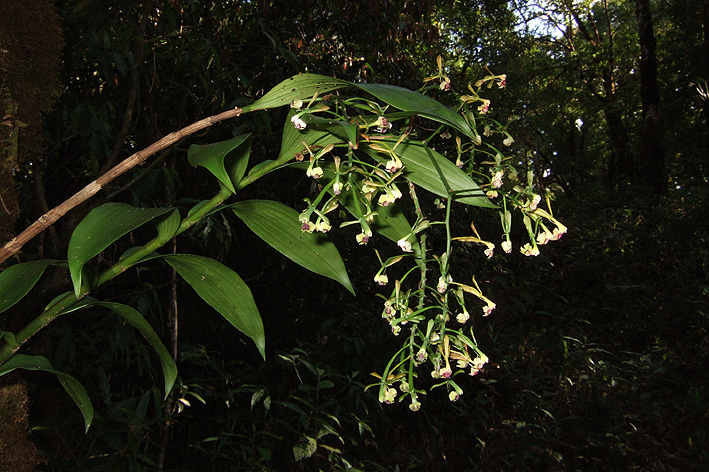 Found in Nicaragua, Costa Rica and Panama on both the Atlantic and Pacific coasts at elevations of 1000 to 2500 meters as a medium to giant sized, cool to cold growing epiphyte or terrestrial with a simple, cane-like, terete, erect, straight stem carrying up to 23, all along the apical 2/3's of the stem, alternate, clearly marked veins, elliptic, acute, entire margined leaves that blooms in the spring on a terminal, occuring only once, thin, laterally compressed, with 1 to 3, prominent, tubular, acuminate bracts, paniculate, arising-nodding, densely, simultaneously 60 to 400 flowered inflorescence with variable in size, narrowly triangular, acuminate floral bracts and carrying non-fragrant flowers.