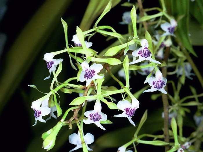 Recognized by the large plants, the numerous green and white flowers, a lip that is marked with purple, filiform petals and the apical lobules of the lip are long and acute.