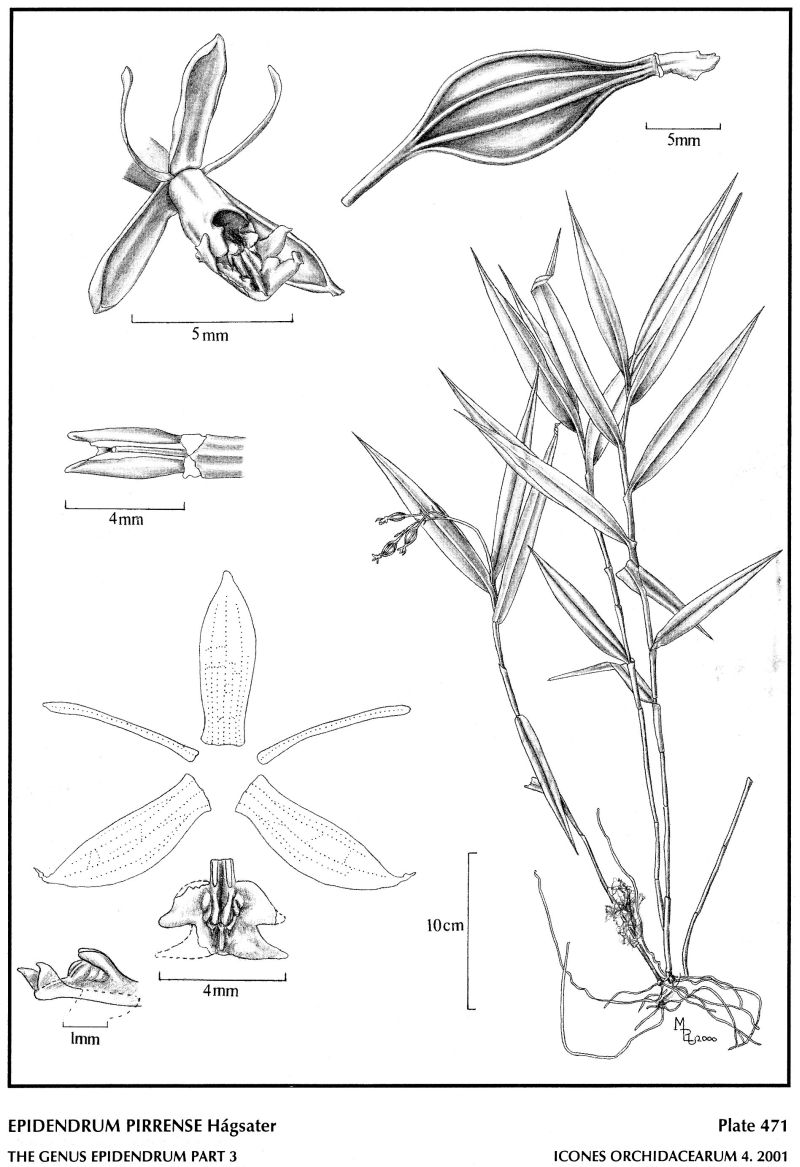 "Epidendrum pirrense belongs to the GROUP Pseudepidendrum SUBGROUP Paniculatum which has caespitose plants, cane-like stems, apical inflorescence, the petals filiform and the lip mostly 4-lobed, pollinia unequal, bird-wing-type. This species has small flowers on an inflorescence with a long thin peduncle, the sepals .2 to .24" [5 to 6 mm] long. It is very similar to E. parviflorum which has smaller leaves, a shorter, thicker peduncle with very similar flowers. Epidendrum poeppigii Hágsater is also similar but has successive flowers, and the leaves about half as wide, the peduncle of the inflorescence thicker and shorter." Hagsater etal 2001
