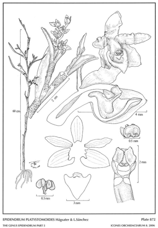 "Epidendrum platystomoides belongs to the GROUP Ramosum which is characterized by the monopodial, branching stems, the spike-like, distichous inflorescence, and the single callus, and the SUBGROUP Rugosum which has a branching habit with few-flowered inflorescence from short, secondary stems, the leaf-sheaths rugose. The species is recognized by the tall, thick, flexuous main stems with long 4,4 to 5.8" [11 to 14.5 cm], narrow leaves and rugose leaf sheaths, the short, distichous Inflorescence with 3 to 6 small, white flowers with .115 to .124"[2.9 to 3.1 mm] long sepals and the triangular-hastate lip which is about as ilde as it is long, bicallose, the calli laminar, very small, and the column arching throughout, short, wlth a funnel-shaped, blunt apex. It is similar to Epidendrum platystomum Hágsater & L.Sánchez which has shorter leaves on the main stem 2 to 3.2" [5 to 8 cm], smaller sepals .092 to .108" [2.3 to 2.7 mm] long, ana a widely, deeply triangular-hastate lip, with the apex thickened and minutely papillose, ecallose, and the column arched at the base only. Epidendrum sanchol Ames has larger flowers, sepals .18 to .26" [4.5 to 6.5 mm long and 5-veined, lanceolate, acute, and a proportionately narrower triangular-hastate, acuminate lip and the union with the column straight and narrow. Epidendrum trachythece Schltr has smaller flowers, sepals .06 to .14" [1.5-3.5 mm] long, 5 to 7 veined, the lip is reniform-apiculate, bicallose, the calli prominent, wide, and reaching the middle of the disc. Epidendrum nutantirhachis Ames & C.Schweinf., grows in the same general area, and has somewhat shorter leaves on the main stem to 3.8" [9.5 cm], larger flowers with the sepals .24 to .44" [6 to 11 mm] long, and a triangular-cordate lip with a prominent fleshy callus and high central keel." Hagsater 2006