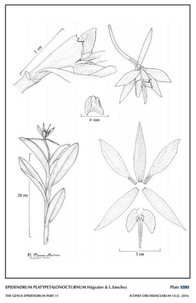 "Epidendrum platypetalonocturnum belongs to the GROUP Nocturnum which is characterized by the sympodial, caespitose plants, short, racemose or pluri-racemose inflorescence, without spathaceous bracts, usually large, star-shaped flowers, with similar sepals and petals, and the Nocturnum Subgroup which has cane-like stems, nonthickened towards the middle, and usually successive flowers; the flowers are mostly indistinguishable in shape. The species is recognized by the laterally compressed stems, ancipitose towards the apex, flowers described by the collector as “pure white”, ovary 2.6" [65 mm] long, sepals and petals comparatively wide, sepals narrowly ovate 1.6 to 1.76" x .34 to .36" [40 to 44 x 8.5 to 9.0 mm] long, petals adnate to the base of the column. Other species in the nocturnum group have the petals totally free of the column, sepals and petals linear-lanceolate, and generally not white, but greenish to yellow to brownish, only the lip and column white, the calli usually yellow, and the mid-lobe, linear, acuminate. Epidendrum tridens has the ovary 2.4 to 4" [60 to 100 mm] long, narrower floral segments, sepals 1.8 to 3" x .2 to .32" [42 to 75 x 5 to 8 mm], green to yellow; petals .1 to .12" [2.5 to 3.0 mm] wide, linear lanceolate, free from the column. Epidendrum nocturnum Jacq. is widely distributed from Florida to Bolivia, has terete stems, ovary 2 to 2.8" [50 to 70 mm] long, about as long as the sepals which are 1.4 to 3" [35 to 75 mm] long, petals free from the column and narrower, 1.6 to 2.4" x .08 to .12" [40 to 60 x 2 to 3 mm], column .6 to .8" [15 to 20 mm] long, body of capsule occupying nearly the full length, centered." Hagsater etal 2015