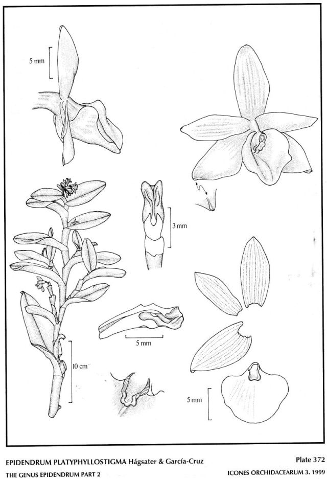 "Epidendrum platyphyllostigma as aprt of GROUP Ramosum SUBGROUP Platystigma characterized by Vanda-like plants when young; before branching occurs, with long, strap-like leaves. The species is recognized by its large plants with big, elliptic leaves, on the main stems 5.2 x 1.8" [13 x 4.5 cm], secondary and tertiary branches with leaves 1.2 to 3.6 [3 to 9 x 1.3 to 3 cm], flowers pale green, ovary straight, sepals .16 to ,2" [4 to 5 mm] wide, lip semiorbicular. Epidendrum ramonianum has narrower leaves, flowers white, column green, ovary arcuate, lip widely ovate, callus tridentate. Epidendrum jefestigma Hágsater & Carda-Cruz has narrower leaves, floral bracts widely ovate, lip subcircular, callus bilobate, clinandrium erose." Hagsater etal 1999