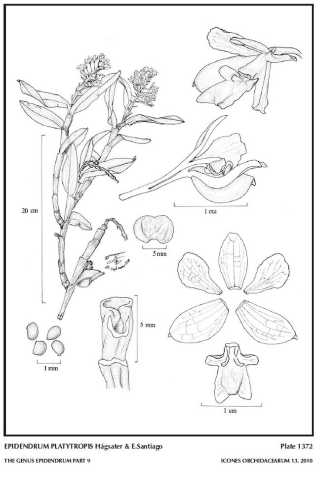 "Epidendrum platytropis belongs to the GROUP Andean SUBGROUP Cernnum, characterized by the monopodial, branching habit, long, erect, cane-like, main stem with subapical branching, leaves sub-coriaceous, with the apex obtuse and the 3-lobed lip and the prominent clinandrium-hood funnel-shaped. The species is recognized by the narrowly elliptic leaves, .6 to 3.2" x .4 to .8" [1.5 to 8 x 1 to 2 cm]; arching inflorescence with green flowers, sepals .36 to .44" [9 to 11 mm] long, 3-lobed lip, the lateral lobes small, rectangular, forming a right angle with the mid-lobe which is obcuneate, with a very wide, fleshy, low keel, clinandriumhood prominent, entire. Epidendrum lawessonii is vegetatively very similar, but the inflorescences are fewer-flowered, flowers white, larger, sepals .68 to .76" [17 to 19 mm] long, and the lateral lobes of the 3-lobed lip suborbicular and retrorse, the column has a pair of prominent lateral, subquadrate wings. Epidendrum sigsigense Hágsater & Dodson has larger elliptic leaves 3.6 to 4.4" x 1.2 to 1.4" [9 to 11 x 3 to 3.5 cm], pendent inflorescences with creamcolored flowers, sepals .56 to .72" [14 to 18 mm] long, 3-lobed lip with the lateral lobes dolabriform, as large as the mid-lobe with is deeply emarginate, forming a pair of sub-quadrate lobes with the apical margin crenate." Hagsater etal 2010