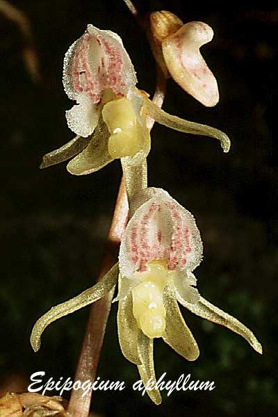 Synonyms Epipactis epipogum Crantz 1769; Epipactis epipogium (L.) All. 1789; Epipogium aphyllum f. albiflorum Y.N.Lee & K.S.Lee 2004; Epipogium aphyllum var. stenochilum Hand.-Mazz. 1925; Epipogium epipogium (L.) H.Karst. 1881; Epipogium generalis E.H.L.Krause in J.Sturm 1905; Epipogium gmelini L.C.M. Richard 1818; Epipogon epipogium (Linne) Karst 1880-3; Epipogon epipogon Kern. 1893; Epipogon generalis E.H.L. Krause 1905; Limodorum epipogium Sw. 1799; *Orchis aphylla F W Schmidt 1791; Satyrium epipogium Linne 1753; Serapias epipogium (L.) Steud. 1821