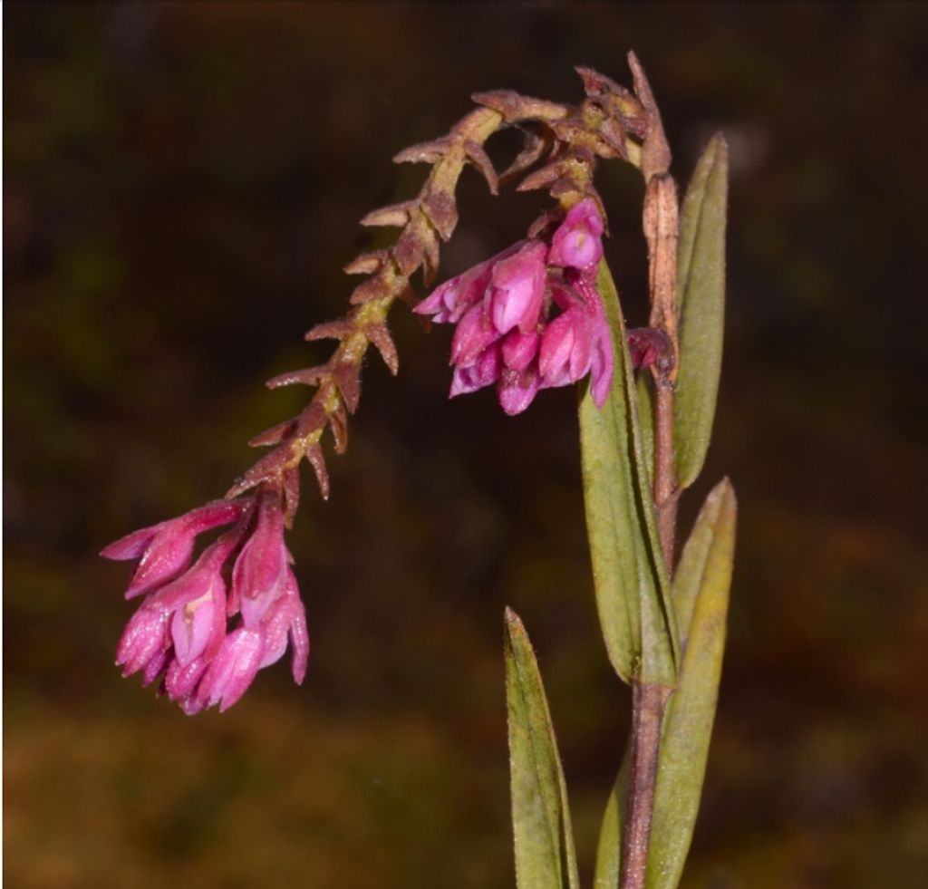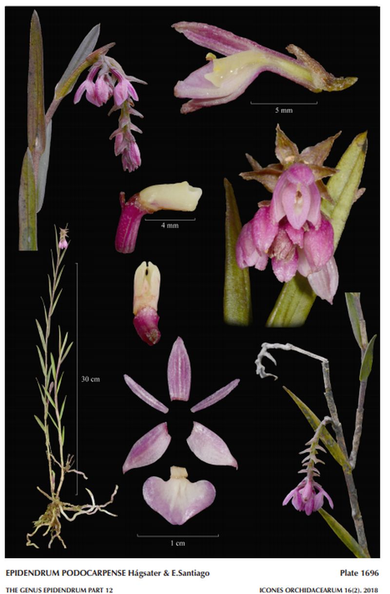 "Epidendrum podocarpense belongs to the GROUP Frutex recognized by the caepitose habit, usually simple stems, lanceolate leaves, lacking spathes, nutant racemes, widely cordiform to reniform lip and GROUP Frutex SUBGROUP Leptanthum which is caracterized by the thin stems, scarecely branched when mature, leaves short, linear-lanceolate to lanceolate oblong, nearly parallel to the stem, inflorescence arching-nutant, apical and lateral in mature stems, racemose to paniculate, few-flowered. The new species is recognized by the erect stems, leaves 1.32 to 2.2" x .24 to .32" [3.3 to 5.5 x 0.6 to 0.8 cm], linear-lanceolate, flowers fucsia-pink, sepals apically acute, minutely apiculate, petals .28 x .48" [7 x 1.2 mm], oblong, apex obtuse, and lip .24 x .36" [6.0 x 9.0 mm], widely cordiform with a pair of triangular, narrow calli. Vegetatively it is very similar to Epidendrum choccei M.E.Acuña, Hágsater & E.Santiago , but that species has prostrate stems, leaves 1.08 to 1.36" x .12" [2.7 to 3.4 x 0.3 cm], narrowly lanceolate, flowers similar in color, but sepals acuminate, petals .24 to .28 " x .28" [6 to 7 x 0.7 mm], linear-oblong, falcate, and the lip .22 x .24" [5.5 x 6.0 mm], widely ovate with the apex acuminate, ecallose. Epidendrum leptanthum Hágsater also has erect stems and similar leaves, but the flowers are cretaceous, greenish white, outside more or less tinged green with red-brown minute dots, lip widely cordiform, callus cuneate, apically bilobed forming a “W”, with a low, narrow central mid-rib reaching the apex. Epidendrum effusipetalum Hágsater, Edquén & E.Santiago has yellowish green flowers, the sepals tinged brown, dorsal sepal obtuse, petals .4 x .04" [10 x 1 mm], outstretched, and the lip .26 x .28" [6.5 x 7 mm], ovate-cordiform, ecallose." Hagsater etal 2018
