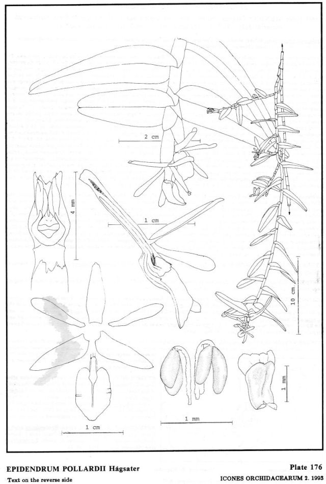 "Epidendrum pollardii is part of GROUP Ramosum SUBGROUP Mirabile characterized by the pendent plants, successive stems produced from a middle internode of the previous stem, without any evident main stem; the flowers white to purple and mostly very fragrant. The long, hanging, branching plants with fleshy, coriaceous leaves less than 2.8" [7 cm] long, flowering from short floral branches, with one or two deep brown to greenish-brown f1owers, the floral segments .36 to .56" [9 to 14 mm} long, and the lip f1at, not enclosing the column, distinguish this species from its relatives. It is similar to E. singuliflorum Schltr. and E. acunae Dressler. but E . singuliflorum has leaves and flowers of a similar size, but the flowers are usually singly produced and the lip is constricted near the middle. E. acunae has larger leaves on the main stem, 4 to 4.8" [10 to 12 cm] long, and larger flowers, sepals .52 to .76" [13 to 19 mm] long (see Hágsater 1990a, 1990b)". Hagsater etal 1993