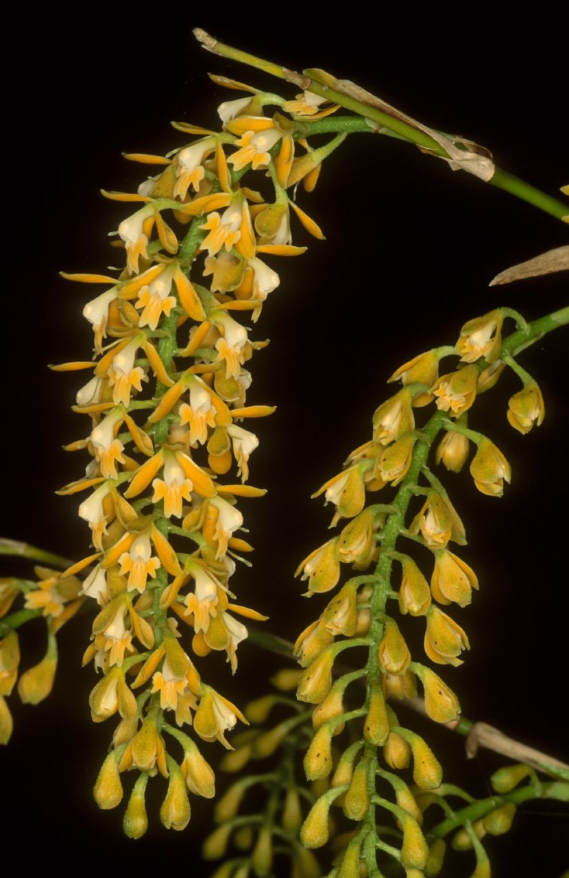 "Epidendrum polyanthum is part of GROUP Anceps which is recognized by the simple stems, generally elongate, compound racemose inflorescence producing new successive racemes with time, fleshy flowers, filiform to narrowly spatulate petals, and the SUBGROUP Polyanthum which has elongate, not subcorymbose racemes. The species is recognized by the terete stems, slightly compressed above, elongate inflorescence, racemose when first flowering, the becoming pluri-racemose, verrucose ovary, sepals .32 to .41" [8 to 10.3 mm] long, slightly verrucose, sepals and petals yellow-orange to orange-ochre, the lip white to pale orange, column white, fragrance herbaceous, disagreeable; the lateral lobes of the lip are semiovate, the margin slit, forming two lobes, the basal one semiobricular, the apical one semiorbicular to triangular, rounded; midlobe oblong-quadrate, the apex bilobed to slit. Epidendrum verrucipes Schltr., though similar, is distinguished by the evident longitudinal veins on the dry leaves, the yellow-orange to greenish yellow flowers, a very disagreeable fragrance, the ovary generally very verrucose-papillose, the sepals dorsally scarcely to densely verrucose-papillose, and the column white to pale orange. Epiedendrum martinezii L. Sánchez & Carnevali has .4 to .8" [1 to 2 cm] wide leaves distributed along the apical half of the stem, sepals and petals .28 to .32" [7 to 8 mm] long, yellow-orange, generally tinged with brown, the basal half of the column green, the apical half of the column and the lip white. Epiedendrum tuxtlense Hágsater, Garda-Cruz & L. Sánchez, endemic from southern Veracruz and northern Oaxaca, has laterally compressed, ancipitose stems, compact racemes, sepals and petals .2 to .28" [5 to 7.5 mm] long, the lateral lobes of the lip suborbicular, entire, and the midlobe subquadrate, slightly wider towards the apex. Epidendrum stallforthianum Kraenzl., from Veracruz, has orange-brown flowers, the lip white and cream colored, the fragrance disagreeable." Hagsater etal 2008