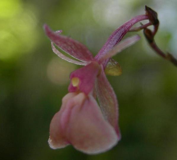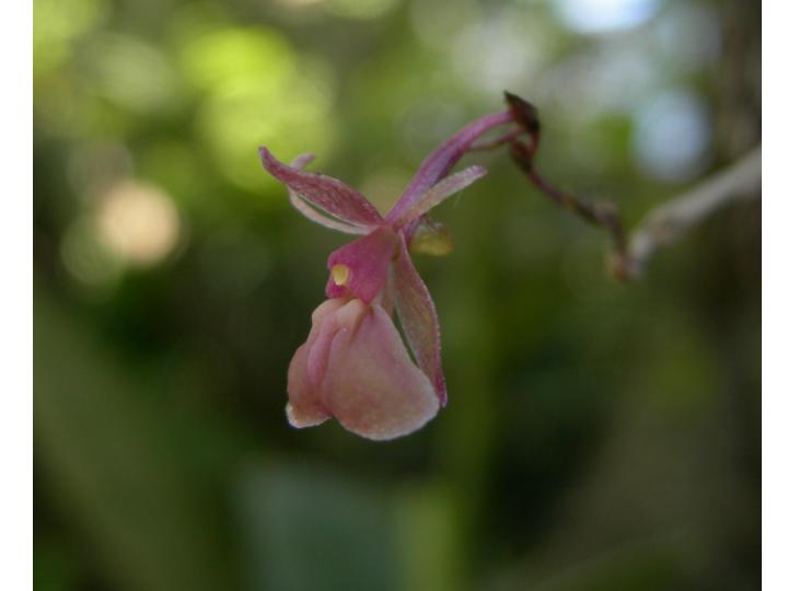 Found in Cuba, Haiti and the Dominican Republic at elevations around 600 to 2000 meters as a small to just medium sized, warm to cool growing epiphyte with approximate, simple, ancipitous, prominently fractiflex, disitchously leafy from the base up stems and carrying 5 to 12, rather thin, dark, narrowly lanceolate, triangular, acuminate, margin entire, coriaceous, green tinged purple, undulate or spirally twisted leaves that blooms in the spring on a terminal, withput a spathe, peduncle 1.88 to 2.8" [4.7 to 7.0 cm] long, arching, strongly zigzag, the apex of the sheaths free as the peduncle is bent in the opposite direction, provided with 5 to 15 bracts diminishing in size towards the apex, tubular, slightly laterally compressed, acuminate, becoming fibrous with age, brown; rachis .68 to 1.48" [1.7 to 3.8 cm] long, zigzag, forming obtuse angles; slender, geniculate, 2.4 to 8.44" [6.0 to 21.1 cm] long overall, apical, elongate, slightly arching, racemose at first flowering, then pluri-racemose; occasionally producing a new plant from a middle internode of an old inflorescence arising at right angles to the following internode, successively single, 4 to 11 flowered inflorescence with acuminate bracts and ovate, acute floral bracts and carrying resupinate flowers with the sepals and petals pink, translucent, lip green-pink, callus and column green and the fragrance not registered.
