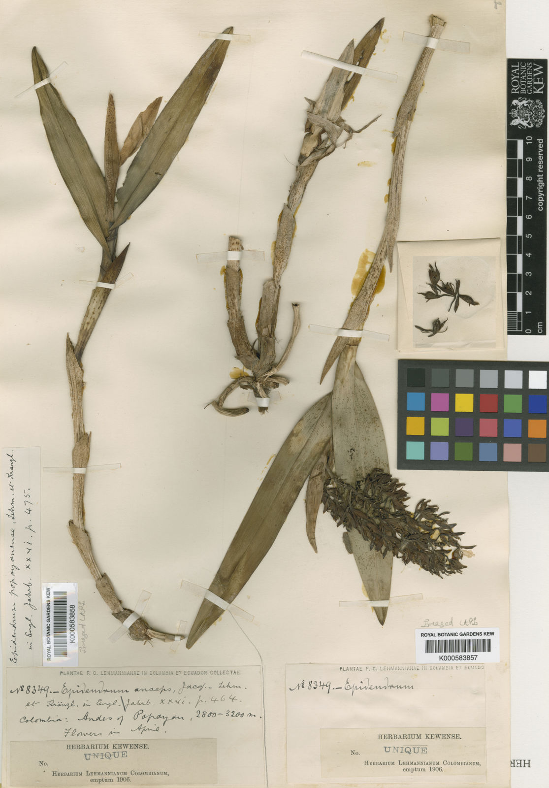 "Epidendrum popayanense F. Lehm. & Kraenzl. belongs to the GROUP Alpicolum Characterized by the simple, cane-like stems, narrowly elliptic acute leaves, long, narrow, 1 to 2 spathaceous bracts giving rise to a foxtail-like inflorescence with small flowers with a lip that is fleshy, prominently midveined when dry, a triangular midlobe and large orbicular lateral lobes that are larger in surface area than the midlobe, also with a prominent, emarginate, entire clinandrum. The species is recognized by the two leaves 48 x 32" x .6 to 1" [120 x 80 x 15 to 25 mm], sepals .44" [11 mm] long, lateral lobes large, flowers olivaceous green with lip pale dirty yellow. Epidendrum oblongialpicolum has a caespitose habit, very wide, ancipitose stem, wide, oblong leaves with a rounded to bilobed apex, and the compact, racemose inflorescence with a short peduncle, sepals .32 to .4" [8 to 10 mm] long, the petals oblanceolate, .032" [.8 mm] wide and single veined, the lateral lobes irregularly lobed and the midlobe lanceolate, about 3 times longer than wide. Epidendrum alpicolum has larger flowers, sepals ca. .72" [18 mm] long, leaves long, lanceolate, and midlobe of lip lanceolate-rhomboid." Adapted from E oblongialpicolum Icones plate 465 Hagsater etal 2010