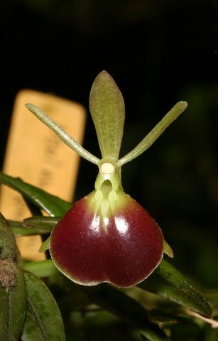 This species has no pseudobulbs, instead it is a stem growing to 3" [8 cm] long with a series of alternating, succulent leaves suffused with purple if given bright light.
