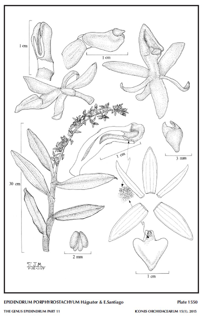"Epidendrum porphyrostachyum belongs to the GROUP Macrostachyum , which is characterized by the monopodial plants with sub-apical branching, rugose leaf sheaths, large leaves generally spreading, racemose, erect inflorescence, and fleshy flowers generally green to black (ripe olive colored), as well as yellow to pink to purple, with an entire, conduplicate, generally ecallose and pubescent lip embracing the column, and the nectary pubescent to papillose in front of the stigmatic cavity and at least at the base of the lip. The species is recognized by the concolor, purple leaves and plants, elongate, many-flowered inflorescence to 9.8" [24 cm] long, narrowly elliptic leaves 5.2 to 5.8" x .92 to 11.24" [13 to 14.5 x 2.3 to 3.1 cm], dorsal sepal and petals slightly reflexed, sepals acute, and the triangular-cordiform lip with the apex much fleshy-thickened. Epidendrum bangii has shorter inflorescences, 2 to 5.6" [5 to 14 cm] long, with about half as many flowers, narrowly lanceolate leaves 2 to 5.6 x ,52 to .96" [5 to 14 x 1.3 to 2.4 cm), green in color, sepals acuminate, and the flowers purple-green to greenish brown to greenish yellow, lip and column basally reddish. Epidendrum oxycalyx Hágsater & Dodson has lanceolate, green leaves 3.6 to 6.8" x 1.12 to 1.8" [9-17 x 2.8 to 4.5 cm], apically acuminate, inflorescence 3.2 to 9.2" [8 to 23 cm] long, sepals and petals long-acuminate, and flowers reddish brown, somewhat tinged yellow. Epidendrum munchiquense Hágsater, E.Santiago & García-Revelo has a much longer 10 to 16" [25 to 40 cm], lax-flowered inflorescence, the leaves green, sepals and petals spreading, the lip deltate with the base sub-truncate, flowers scarlet, turning grayish brown after extracting the pollinia." Hagsater 2015