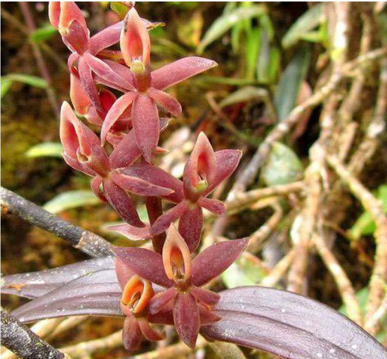 Common Name The Purple Ear of Corn Epidendrum [refers to the purple flowers, stem and leaves of this species that set it apart from others in the Macrostachyum group]