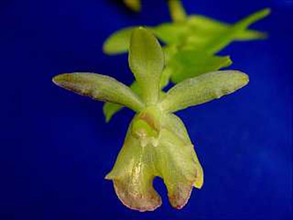 Found in Ecuador as a miniature to small sized epiphyte with a simple, cane-like, terete stem carrying 10 to 13, evenly distributed along the stem, leaf sheath tubular, somewhat infundibuliform, ovate-lanceolate, acute, fleshy, apical margin minutely ciliate, pale green with scarce, minute purple dots that do not form transversal bands leaves that blooms in the late summer on an apical, erect, short, subsessile simultaneously 2 flowered inflorescence arising through a single, conduplicate, oblique, semi-ovate, truncate, margin minutely dentate spathe that covers about half of the ovary and carrying resupinate, foul scented [sulpher] flowers.
