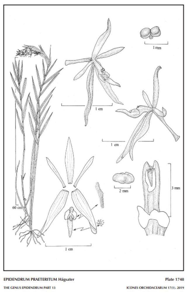 "Epidendrum praeteritum belongs to the GROUP Alpicolum SUBGROUP Alpicolum, which is recognized by the caespitose habit, simple, canelike stems, apical racemose inflorescence subtended by 1 to 3 acute spathaceous bracts, the flowers fleshy, linear petals and a 3-lobed lip, bicallose with short, fleshy keels, the mid-lobe triangular and fleshy. The new species is recognized by the caespitose habit, numerous narrowly lanceolate leaves to .56 x .36" [14 x 0.9 cm], inflorescence as long as the apical leaves, pale yellow relatively large flowers, lateral sepals .408 to .448" [10.2 to 11.2 mm] long, 5-veined, lip .228 x .104" [5.7 x 2.7 mm]. It is similar to Epidendrum cornutum Lindl., which also has a caespitose habit, wider leaves to 5.4 x .56" [13.5 x 1.4 cm], the inflorescence shorter than the apical leaves, white, very fragrant flowers, lateral sepals .492" [12.3 mm] long, 5 veined, and a longer lip, .292 x .16" [7.3 x 4 mm]. Epidendrum alpicoloscandens Hágsater & Dodson, has a scandent habit, about half as many leaves, the inflorescence much surpassing the apical leaves, smaller, pale yellow-orange flowers, lateral sepals .346" [8.6 mm] long, 3-veined, and lip 4.0 x 2.5 mm." Hagsater etal 2019
