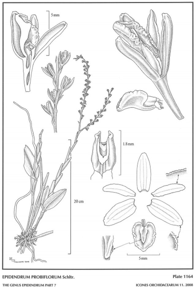 "Epidendrum probiflorum belongs to the GROUP Carloii which is characterized by the caespitose habit, short, unbranched, laterally colllpressed stems, thick, coriaceous leaves, and the long, arching, nutant, rat-tail-like inflorescence with long bracts at the base, and the numerous, successive flowers. The species is recognized by the generally paniculate inflorescence, oblong-lanceolate to ovate-lanceolate leaves, up to 60 purple-brown to creamy peach colored flowers and the lip white, ovate-triangular with a prominent, concave-sulcate, fleshy keel, the margin erose-crenate. Epidendrum carolii Schltr. has a shorter, racemose, arching inflorescence with up to 23 copper colored flowers tinged with purple, the lip yellow, widely ovate to reniform, with a fleshy, non-sulcate keel, and the entire margin slightly erose-crenate. Epidendrum laucheanum Rolfe ex Bonhof, has much larger plants, long, narrowly lanceolate, acuminate leaves, up tp 80 flowered, racemose, arching-nodding inflorescence, with ochre to purple-brown flowers, the lip apple-green, the margin entire." Hagsater etal 2008