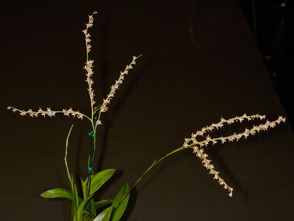 Found in Panama at elevations around 1000 to 1200 meters as a medium sized, cool growing epiphyte with simple, basally terete, laterally compressed towards the apex, cane-like stems the basal 2/3's enveloped by scarious, tubular, non-foliaceous sheaths and carrying 2 to 4, towards the apex, unequal in size, suberect, articulate, distichous, coriaceous, oblong-lanceolate to ovate-lanceolate, acute, margin entire leaves that blooms in the summer on a terminal, erect to slightly arching, racemose to paniculate, occuring only once, laterally compressed, somewhat ancipitous, straight to flexuous, 8 to 60 flowered inflorescence with 3 to 9, tubular, acute to subacute, ancipitous, partly imbricating bracts and as long as the ovary or shorter, triangular-lanceolate, ahort acuminate floral bracts and carries successive flowers starting opening at the base.