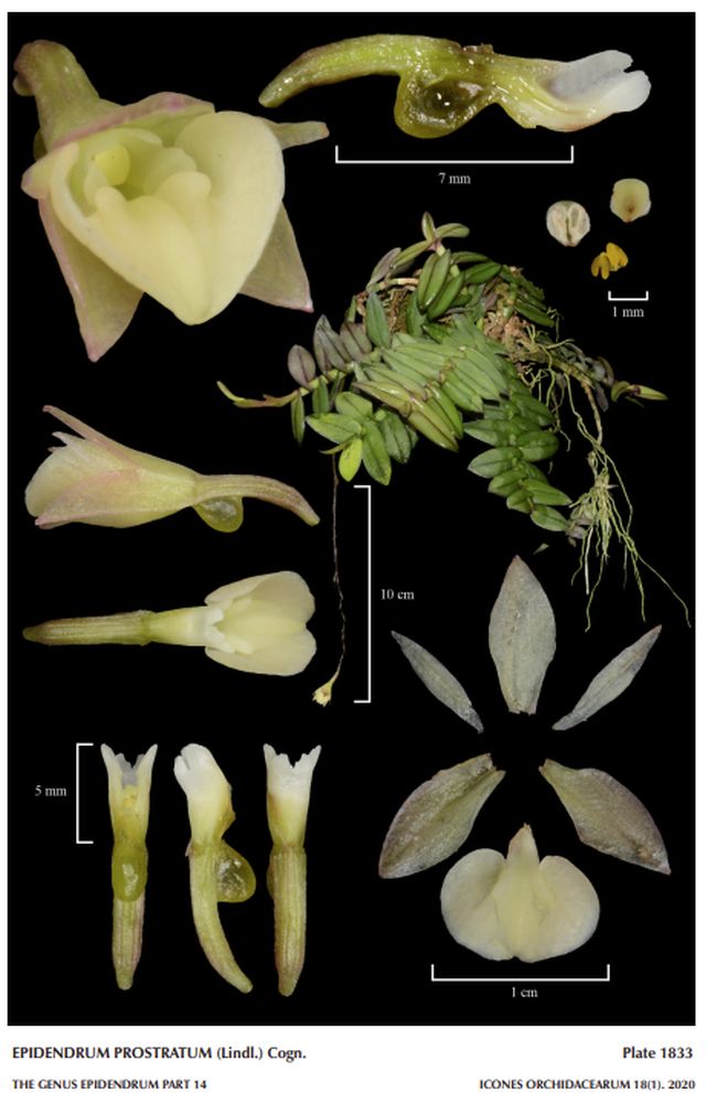 "Epidendrum prostratum belongs to the GROUP Physinga which is characterized by the generally small, caespitose plants, the inflorescence apical and racemose producing new racemes with time and thus pluri-racemose, the successive flowers opening one at a time on an elongate peduncle with acuminate bracts, and the lip entire and the ovary with a prominent vesicle. The species is recognized by the short stem with numerous fleshy leaves, spreading, lying on the same plane as the stem, lanceolate, apex acute, the flowers trumpet-shaped, green to pale rose-purple, lip white, the lip transversely reniform, 3- ribbed, sepals 7.0-9.7 mm long and the clinandrium-hood very prominent and deeply emarginate. Epidendrum macroclinium is vegetatively very similar but is recognized by the .6 to 1.8" [1.5 to 4.5 cm] long, spreading, ovate-lanceolate, gray-green leaves, sometimes with the foliar veins thickened and very evident on the basal half of the upper side of the leaves, but smaller flowers; sepals .2 to .28" [5 to 7 mm] long, petals linear lanceolate, clinandrium-hood very large, entire, funnel-shaped, apical margin dentate, and the lip bilobed with a single mid-rib. Epidendrum physodes Rchb.f. has sepals 7 mm long, column longer 3.5-4 mm long, is truncate lacking a prominent clinandrium-hood, the lip entire, transversely ovate, apex entire. Epidendrum polygonatum Lindl. has a zig-zag inflorescence, and a sub-reniform lip, apically emarginate, disc tricallose, 5-ribbed. Epidendrum acreense (Brieger & Bicalho) Christenson has sepals .2 to .24" [5 to 6 mm] long, and the lip transversely oblong, apex slightly emarginate, with two prominent, long call." Hagsater etal 2020