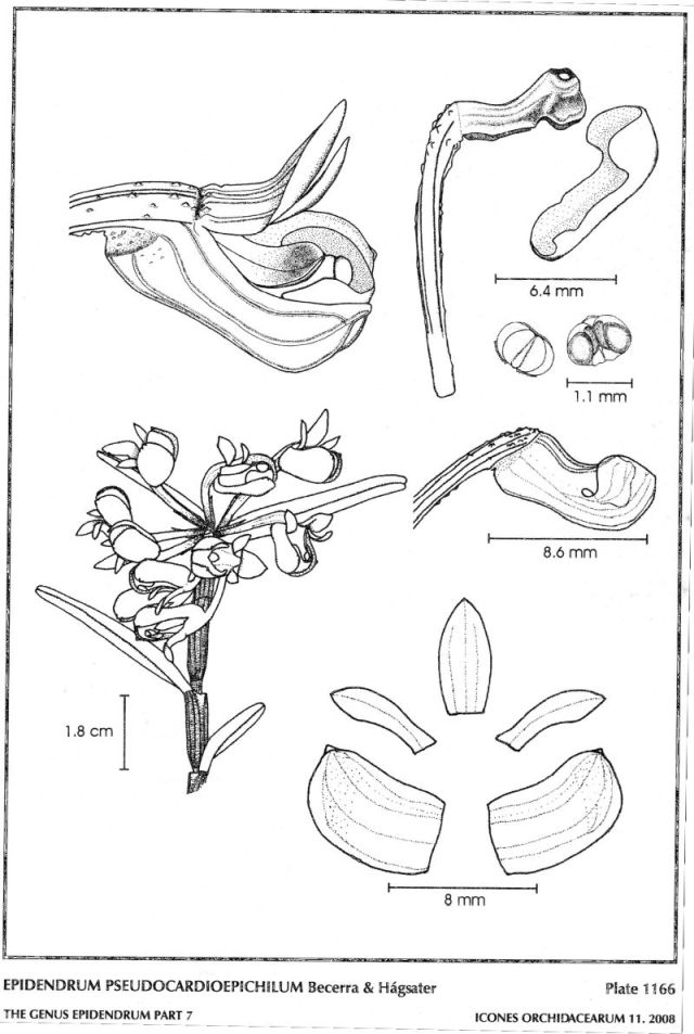 "Epidendrum pseudocardioepichilum belongs to the GROUP Diothonea SUBGROUP Diothonea which is characterized by the branching habit, linear-lanceolate to lanceolate, bilobed leaves, arching-nutant, racemose inflorescence, membranaceous or rarely fleshy flowers, the lip entire to 3-lobed, with an erose margin, ecallose, with or without 1 to 10 thin, smooth to erose keels, the column united to the lip from totally to obliquely to free. The species is recognized by the short inflorescence with green flowers, becoming tinged with magenta towards the apex of the floral segments, the base of the lip forming a pouch with the column, the free portion of the lip narrow and abruptly expanded and reniform, embracing the apex of the column which has a pair of quadrate wings at the apex. It is similar to Epidendrum cardioepichilum has yellowish-brown flowers with the apex of the lip pink, the floral segments nearly parallel to the column, the apices revolute, the base of the lip forming a large cavity with the column, and the apex widely cordate and embracing the apex of the wingless column. Epidendrum globiflorum F.C. Lehm. & Kraenzl., has oblong-ovate leaves, a very short inflorescence ca. .4" [1 cm] long), greenish-white flowers, the lip united to the column throughout, clearly 3-lobed and with the margin spreading. Epidendrum pseudoglobiflorum Hágsater & Dodson has a dense inflorescence, the flowers trumpet-shaped, the sepals connate, orange to vermillion-red colored, and the lip suborbicular-hexagonal, totally united to the column. Epidendrum trachysepalum Hágsater also has a saccate lip, but the column is free, and the sepals dorsally uncinate." Hagsater etal 2008