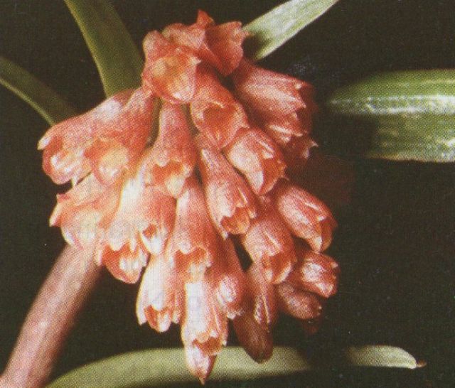 Found in southern Ecuador around Loja on the eastern slope of the Andes at elevations of 2600 to 3300 meters as a small to medium sized, cold growing epiphyte with cane-like, terete, thin, sinuous, newly arising from an upper internode of the previous stem carrying about 8 on the initial stem, 3 to 6 on the upper stem, lanceolate-oblong, obtuse, bilobed, with a low dorsal keel, margin entire leaves that blooms in the fall theough winter on a terminal, racemose, peduncle short, bractless, subglobose, dense, simultaneously 7 to 20 flowered inflorescence with about half as long as the ovary, lanceolate, acute floral bracts and carrying resupinate, trumpet shaped, orange to vermillion red flowers.