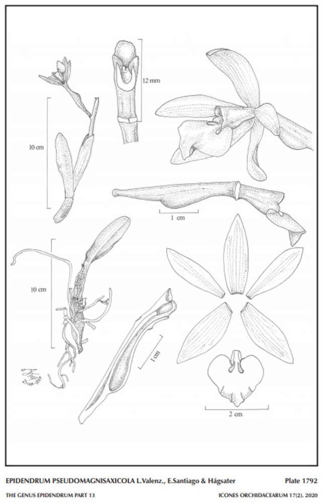 "Epidendrum pseudomagnisaxicola belongs to the GROUP Saxicola characterized by the pseudobulbous stems, caespitose or scandent habit, a prominent spathe apically rounded, a few-flowered erect inflorescence, and the flowers purple or yellow. The new species is recognized by the sepals red, petals and lip creamy green and column cream colored sepals 1 to 1.08" x .3 to .36" [25 to 27 x 7.5 to 9.0 mm], oblong-lanceolate, lip .6 to .78" x .78 to .8" [15 to 17 x 17 to 20 mm], triangular-cordiform, apex with 2 folds and the ovary, inflated in the middle forming an elongate vesicle that does not reach the apex of the ovary. Epidendrum magnisaxicola Hágsater, Edquén & E.Santiago has pale greenish-yellow flowers with brown-colored sepals .96 to 1" x .26 to .28" [24 to 25 x 6.5 to 7.0 mm], and the lip .54 x .44" [13.5 x 11 mm], ovate rhombic with the base truncate. Epidendrum microcattleyioides D.E.Benn. & Christenson has yellow flowers with the margin white, sepals .48 to .52" [12 to 13 mm] long, lip reniform, widely emarginate, with a single mid-rib, and a geniculate ovary. Epidendrum saxicola Kraenzl. has purple flowers with a white lip tinged purple, sepals .6" [15 mm] long, petals .52 x .1" [13 x 2.5 mm], and a lip sub-orbicular to obscurely pentagonal. Epidendrum herreranum C.Schweinf. has yellow tinged orange to reddish bronze flowers, petals .68 to .92" x .2 to .4" [17 to 23 x 5 to 10 mm], obovate-spatulate, and a lip 3-lobed, the lateral lobes obliquely semi-orbicular. Epidendrum milpoense Hágsater & E. Santiago has green flowers, sepals .72 to .76" [18 to 19 mm] long, petals .64 to .7" x .2 to .28" [16 to 17.5 x 5 to 7 mm], rhombic-spathulate, the lip widely cordiform, base deeply cordate, disc fleshy with 3 low ribs which reach the apical sinus, and the ovary slightly inflated beyond the middle." Hagsater etal 2020