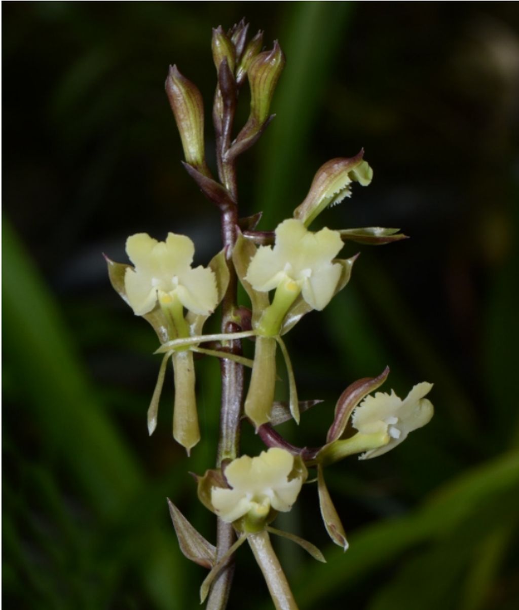 Found in Colombia, Ecuador and Peru widespread along the Andes from the western slope of the Cordillera Oriental at elevations of 1800 to 3150 meters as a small to medium sized, cool to cold growing epiphyte with simple, cane-like, laterally compressed, straight, covered by foliar sheaths, the basal, non-foliar, scarious sheaths and carrying 4 to 8, alternate, articulate, distributed along apical 2/3 of the stem, coriaceous, base conduplicate; sheaths tubular, laterally compressed, green tinged purple, striated; blade narrowly elliptical to oblanceolate, acute, margin entire, slightly revolute, dark green above, purple beneath leaves that blooms at most any time of the year on a terminal, arising through a single tubular at base and conduplicate at the apex, acute to acuminate spathe, peduncle 3.56" [8.9 cm] long, slightly laterally compressed, totally covered by 2 to 4 bracts, similar to the spathe but smaller and decreasing, partly imbricated, rachis .32 to .56" [8 to 13 cm] long, 2.4 to 12" [6.0 to 30 cm] long, apical, racemose in young plants to producing a new additional raceme in older plants, the second raceme from the base of the rachis, lax successively few, 4 to 22 flowered inflorescence 5.0-15 mm long, shorter than the ovary, ovate-triangular, acuminate, embracing, yellowish brown floral bracts and carrying non-resupinate, nob-fragrant, green flowers with sepals with red lines on the dorsal surface, turning reddish brown as the flowers age, lip pale green.