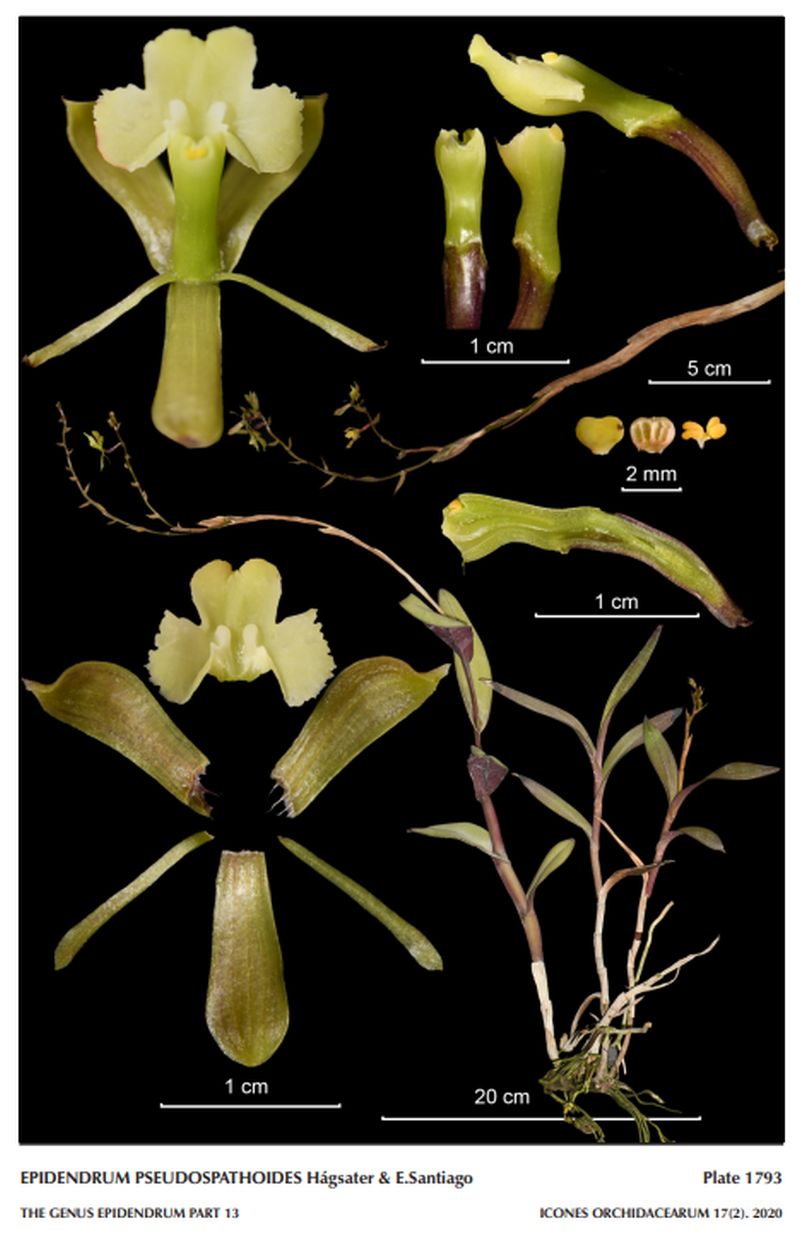 "Epidendrum pseudospathoides belongs to the GROUP Philippii characterized by the sympodial, caespitose habit, the apical, erect, racemose to paniculate inflorescence with a somewhat elongate peduncle covered by several spathe-like bracts, the successive non-resupinate flowers, and the 3-lobed lip formed by 4 semiorbicular lobes, the mid-lobe is itself more or less bilobed at the apex, the outer margins of the lip more or less denticulate. The new species is recognized by stems with 4 to 8 leaves 1.68 to 4.76" x .76 to 1.52" [4.2 to 11.9 x 1.9 to 3.8 cm], dark green above, purple beneath, inflorescence to 12" [30 cm] long , the peduncle totally covered with up to 4 bracts similar to the spathe but decreasing in size, flowers green, sepals with dorsal red lines, sepals .44 to .64" [11 to 14 mm] long, and the lip 3-lobed, the lateral lobes dolabriform and mid-lobe sub-quadrate and emarginate, forming a pair of semi-orbicular lobules, slightly shorter than the lateral lobes. Epidendrum freireanum Hágsater & E.Santiago has stems with 3 to 4 leaves 1.48 to 2.8" x .44 to .8" [3.7 to 7.0 x 1.1 to 2.0 cm], inflorescence 4.4 to 8" [11 to 20 cm] long, sometimes pluri-racemose with a single small spathe, flowers brownish purple, the lip ivory white, sepals .4" [10 mm] long, and a lip 3- lobed, the mid-lobe rectangular and widely mucronate. Epidendrum odontospathum has elliptic leaves with the apex rounded, sepals elliptic with apex rounded, minutely apiculate, petals oblanceolate, rounded with margin crenulate towards the apex, and the lip with 3 low, fleshy ribs, lateral lobes obliquely reniform, mid-lobe semicircular, broadly redounded. Epidendrum lezlieae R.Vásquez & Ibisch has tall plants, to 48" [120 cm], a paniculate, erect inflorescence with greenish white flowers, petals linearoblanceolate .56 x .048 [14 x 1.2 mm], and a lip 3-lobed, base cordate, the posterior margin involute in natural position, calli prominent, laminar, and parallel when upright, divergent when spread. Epidendrum spicatum Hook. the only species of Epidendrum and endemic to the Galapagos, is very similar florally, only the inflorescence is short and compact; from a molecular point of view they are most closely related (Hágsater, unpublished)." Hagsater etal 2020