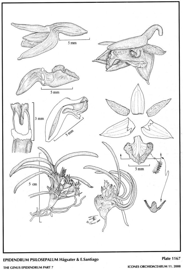 " Epidendrum psilosepalum belongs to the GROUP Takulumena which is recognized by the small, Vanda-like plants, with simple, imbricating, distichous leaves, and a lateral complicated inflorescence, producing new, single-flowered segments over several years. The species is recognized by the intermediate size of the reddish yellow-green flower, sepals .28 to .32" [7 to 8 mm] long, with the sepals glabrous, and the ventral surface of the petals and lip strongly pubescent. It has been confused with E. sophronitoides F.Lehm. & Kraenzl. which has larger flowers, the floral segments glabrous and acuminate, .4 to .64" [10 to 16 mm] long. Epidendrum dasyanthum Hágsater has the ventral surface of all the segments strongly pubescent, and is widespread down to northern Peru, along the eastern ridge of the Andes. Epidendrum rhodovandoides Hágsater has small, cardinal red to reddish magenta flowers, the floral segments generally glabrous, sepals .16 to .2" [4 to 5 mm] long, and is known only from northern Antioquia department of Colombia and western Venezuela in Táchira state." Hagsater etal 2008