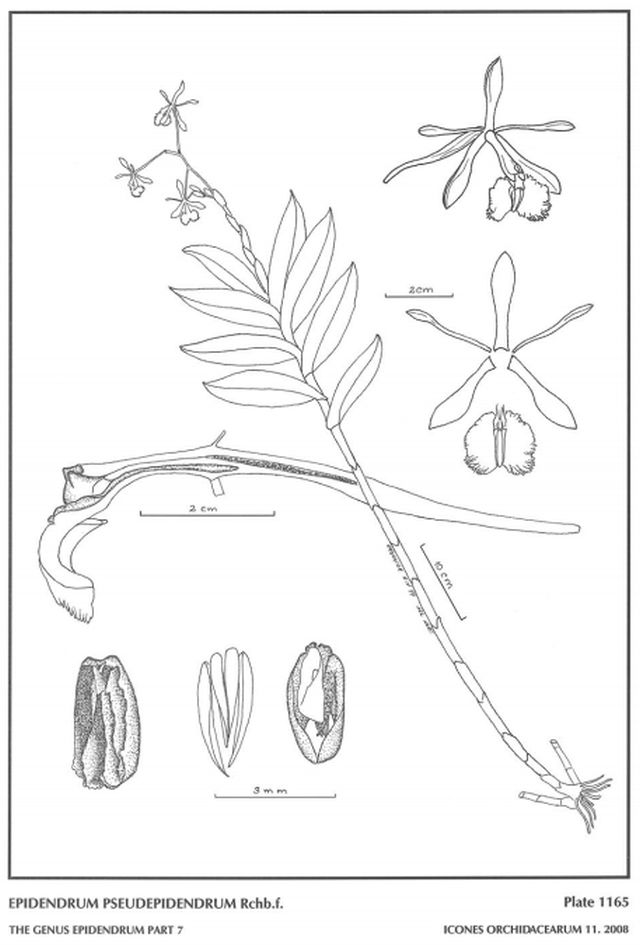 References W3 Tropicos, Kew Monocot list , IPNI ; Xenia Orchidaceae Rchb.f 1854 drawing fide; Die Orchideen Schlechter 1915; Atlas des Orchidees Cultivees Constantin 1920 drawing fide; The Genus Epidendrum Ames 1936; The Orchids of Panama L.O. Williams & P Allen 1946; Ceiba Vol 5 No 1 L O Williams 1956; AOS Bulletin Vol 31 No 3 1962; Encyclopedia of Cultivated Orchids Hawkes 1965; Die Orchideen 3 Auflage Bd 1 Sonderabdruck aus Schlechter Lieferung 9 513 - 576 Brieger, Maatsch and Senghas 1977 as Pseudepidendrum spectabile drawing fide; AOS Bulletin Vol 50 No 6 1981 photo fide; ORQUIDEA (Méx.) 9(2): 1984 photo fide; Orchids Travel By Air A Pictoral Safari Mulder, Mulder-Roelfsema and Schuiteman 1990 photo fide; Icones Planetarum Tropicarum plate 1432 Atwood 1992 drawing fide; The Illustrated Encyclopedia of Orchids Pridgeon 1992 photo fide; The Manual Of Cultivated Orchid Species Bechtel, Cribb & Launert 1992 photo fide; Field Guide to the Orchids of Costa Rica and Panama Dressler 1993; Icones Orchidacearum 2 plate 197 Hagsater & Salazar 1993 see recognition section; Manual Of Orchids Stewart 1995 drawing fide; AOS Bulletin Vol 66 No 11 1997 photo fide; Orchids Australia Vol 10 No 5 1998 photo; AOS Bulletin Vol 67 No 9 1998 photo fide; Orchid Australia Vol 12 No 3 2000 photo; Botanica's Orchids Laurel Glen 2002 photo fide; Manual de las Plantas de Costa Rica Vol 3 Hammel, Grayum, Herrera and Zamora 2003 drawing fide; Flora's Orchids Nash & La Croix 2005 photo fide; Vanishing Beauty, Native Costa Rican Orchids Vol 1 Pupulin 2005 photo fide; Genera Orchidacearum Vol 4 Epidendoideae Part one Pridgeon, Cribb, Chase and Rasmussen 2005 photo fide; AOS Bulletin Vol 77 No 8 2008 drawing fide; Icones Orchidacearum Vol 11 Plate 1102 Hagsater & Sanchez 2008 see Recognition section; Icones Orchidacearum Vol 11 Plate 1165 Hagsater & Sanchez 2008 drawing fide; Orchids of Costa Rica Vol 3 Morales 2009 photo fide; Orchid Digest Vol 74 #2 2010 photo fide; Icones Orchidacearum 14 Plate 1434 Hagsater & Santiago 2013 See recognition section; AOS Bulletin Vol 86 # 3 2017 photo fide;