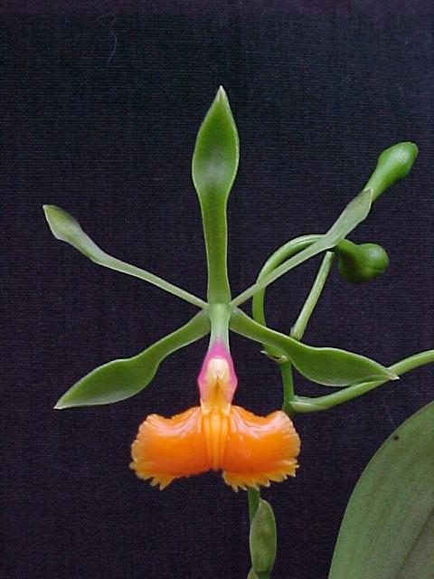 "Epidendrum pseudepidendrum belongs to the GROUP Pseudepidendrum which is characterized by caespitose plants, cane-like stems, acute to acuminate leaves, usually apical inflorescence, the filiforrn petals and the lip usually 3-lobed with 3 parallel fleshy keels, the apical lobe often bifurcate, the "bird-wing" type pollinia, and SUBGROUP Turialvae which has a racemose and few-flowered inflorescence on an elongate peduncle, producing new racemes over the years and thus pluriracemose. The species is recognized by the generally tall plants, with elliptic leaves 2 to 8" x .8 to 2.4" [5 to 20 x 2 to 6 cm], lax and few-flowered, apical inflorescence, the large flowers with dark green sepals and petals, and a solid, lustrous, orange lip wilh the column basally green, and apex red to violaceous. Epidendrum xanthoianthinum Hágsater = E. pseudepidendrum var auratum Rchb.f. from Colombia, has lhe lip clearly 3-lobed, the midlobe divided into two subquadrate, divaricate lobes, the green flowers with a lemon-yellow lip with the disc and apex of the column purple to yellowish purple." Hagsater etal 2008
