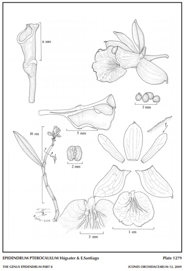 "Epidendrum pterocaulum is recognized by the racemose inflorescence with an ancipitose peduncle, short rachis with a few showy, purple flowers, sepals about .4" [10 mm] long, the lip with thickened, smooth, branching, radiating veins, and the inflated nectary just behind the perianth. We have not been able to place it to a group, though the flattened peduncle of the inflorescence is reminiscent of the GROUP Neowilliamsia , but the pollinarium lacks the hard, tape-like caudicles. The GROUP Albertii SUBGROUP Allenii also has a flattened, two-winged peduncle, but the floral bracts are ovate-elliptic, conduplicate and imbricating. The flowers of Epidendrum suavis have similar, obliquely united column-lip, and ecallose lip, but has monopodial plants where the new stem originates from the apical internodes of the previous stem, leaves are linear-lanceolate and inflorescences lax-flowered, the flowers yellow to yellowish brown." Hagsater etal 2009