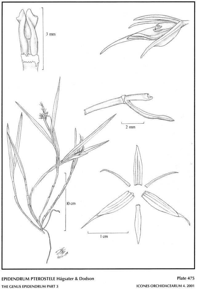 " Epidendrum pterostele belongs to the GROUP Alpicolum SUBGROUP Dialychilum and is recognized by the free, narrowly elliptic, acute lip, the filiform petals, and the short column with a prominent, irregular clinandrium prolonged on both sides at the base into wings; the stigmatic cavity occupies the apical half of the ventral surface, the basal half prominently sulcate. The species is closely related to and simpatric with E. dialychilum in which the stigmatic cavity occupies nearly the whole underside of the column, the column is widened towards the middle. Epidendrum rhopalostele Hágsater & Dodson has a thin, club-shaped column, with the stigmatic cavity occupying about 1/3 of the underside and a reduced clinandrium. Epidendrum dialyrhombicum Hágsater & Dodson has smaller flowers, the sepals .12 to .16" [3 to 4 mm] long, the lip free from the column, rhombic with a long narrow claw perpendicular to the base of the lip and then turning up and parallel to it, the column with the rostellum projecting beyond the rest of the body." Hagsater etal 2001