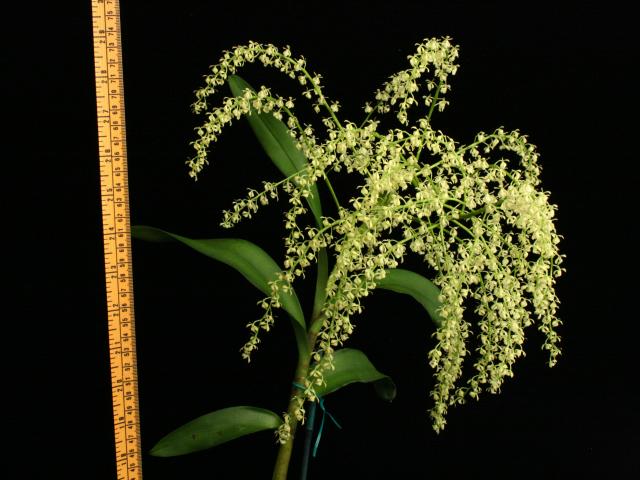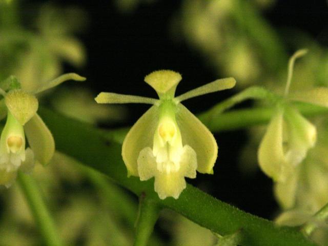 Found in Peru in wet montane forests at elevations around 1200 meters as a large sized, cool growing epiphyte with a simple, cane-like, flexuous stems carrying along the apical half, subcoriaceous, oblong-lanceolate, minutely bilobed, articulate below into the base leaves that blooms in the earlier fall on a terminal, erect, finely pubescent, paniculate, densely many flowered inflorescence with several arcuate branches, and carrying finely pubescent, simultaneously opening, resupinate flowers.