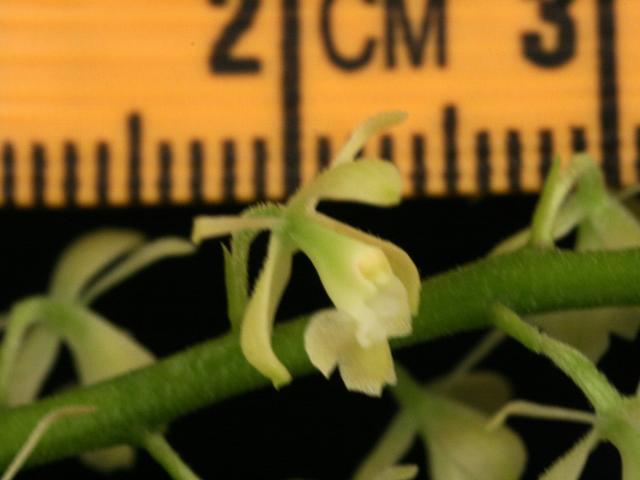 "Epidendrum pubiflorum C. Schweinf. belongs to the GROUP Amblostoma SUBGROUP Amblostomioides which is characterized by the caespitose habit, the thinly fusiform stems with narrow, apically bilobed, subcoriaceous leaves distributed along the apical half of the stems, an often large, apical, erect, paniculate inflorescence, the flowers greenish-yellow to white, the ovary and the sepals usually dorsally pubescent, ano the lip 3-lobed. The species has the rachis finely pubescent, slightly larger flowers about as heavy looking, but the petals are .08" [2 mm] wide and the lip is bicallose and 3-keeled, the lateral lobes dolabriform and the midlobe cuneate, truncate. Epidendrum ancirotrotylosum has short, thickened stems, an erect, relatively large, paniculate inflorescence, the rachis glabrous, heavy flowers, the ovaries pubescent, the sepals dorsally sparsely short-pubescent, petals linear, falcate, and the lip deeply 3-lobed, the lateral lobes obliquely oblong-reniform, the midlobe narrowly subrhombic, obtuse, bicallose, the calli with a cuniculus beneath them, and a semicircular, anchor-shaped structure in front. Epidendrum lanipes Lindl. has larger plants and flowers strongly fragrant of citrus, the rachis as well as the ovaries are pubescent, lateral lobes of the lip semiovate, midlobe cuneate, retuse, bicallose with three short keels in front." Adapted from E ancistrotylosum Icones Plate 704 Hagsater etal 2004