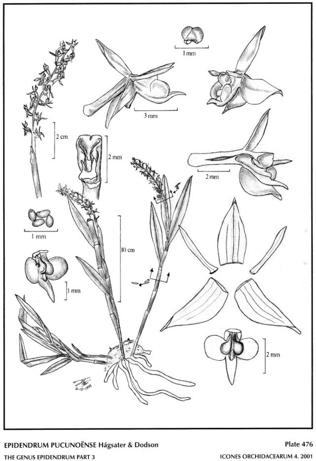 "Epidendrum pucunoense belongs to the GROUP Alpicolum characterized by the simple, cane-like stems, long, narrow 1 to 3 spathaceous bracts, fox-tail-like inflorescence and numerous flowers with fleshy lip. The species is recognized by the small flowers, the sepals prominently midveined when dry, the large orbicular lateral lobes of the lip, larger in surface than the midlobe, and the emarginate, entire, prominent clinandrium, the leaves are narrowly elliptic and acute. It is close to Epidendrum zosterifolium which has sepals .2 to .28" [5 to 7 mm] long, greenish white f1owers, with the middle near the apex of sepals and lip deep green, lateral lobes of the lip small and erose, the prominent funnel-shaped, bilobed, erose clinandrium, a strong, daytime, spicy fragrance, leaves oblong, bilobed." Hagsater 2001