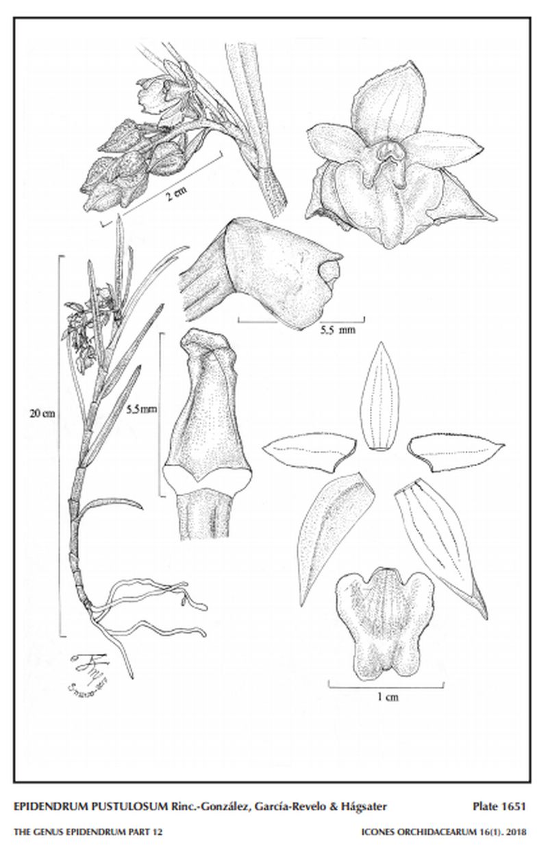 "Epidendrum pustulosum belongs to the GROUP Diothonea characterized by the branching habit, linear-lanceolate to lanceolate leaves, the apex usually narrowly bilobed, arching-nutant, racemose inflorescence, membranaceous or rarely fleshy flowers, the lip entire to 3-lobed, with an erose margin, ecallose, without or with 1 to 10 thin, glabrous to erose keels, the column variously united to the lip from totally, to obliquely, to totally free. Epidendrum pustulosum is recognized by the monopodial, mature plants scarcely branching, with yellow and green flowers, sepals dorsally pustulate, lip 3-lobed, margin slightly revolute, column slightly arched and the apex forming a wide aperture. It is very similar to Epidendrum litteraënse but that species has very much branched stems, flowers green marked with reddish brown, and the apex of the column forming a very narrow vertical slit, as an entrance to the nectary. Epidendrum aureoglobiflorum Hágsater & Dodson has yellowish brown flowers, sepals dorsally ornate with prominent, spaced warts; lip entire, and the inflorescence is very short and dense (1 cm long). Epidendrum gratissimum (Rchb.f.) Hágsater & Dodson has flowers varying in color from pink to yellow, the sepals dorsally glabrous, lip 3-lobed, with the mid-lobe itself bilobed, column with a pair of prominent, involute wings. Epidendrum tropinectarium Hágsater & E.Santiago has pink colored flowers, sepals glabrous, column arched upwards, petals linear, acute." Hagsater 2018