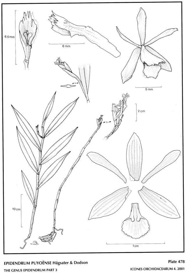 "Epidendrum puyoense belongs to the GROUP Alberti SUBGROUP Physinga, recognized by the caespitose habit, apical and lateral inflorescences, successive flowers with the ovary covered by large, conduplicate bracts, peduncle frequently ancipitose. The species is distinguished by the ancipitose stems, elongate inflorescence, sepals partly spreading, .32 to .4" [8 to 10 mm] long, the lip suborbicular, the margin erose-dentate and the clinandrium prominent, much surpassing the body of the column, funnel-shaped and deeply fimbriate. Epidendrum dalessandroi Hágsater & Dodson has much larger plants and flowers, the sepals .8 to .88" [20 to 22 mm] long. Epidendrum notabile Schltr. also has a dentate margin of lip and petals, but short, subsessile inflorescences and a short clinandrium. Epidendrum gentryi Dodson has somewhat swollen, terete stems, only apical inflorescence, larger flowers, sepals .48 to .52" [12 to 13 mm] long, clinandrium prominent, but narrow, tubular, entire, and the lip suborbicular with the margin entire. Epidendrum dactyloclinium Hágsater & Dodson has larger flowers, a prominent three-lobed clinandrium with the lateral lobes finger-like, the dorsal lobe deeply dentate, the lip triangular with the corners rounded, sepals spreading, and the petals linear-oblanceolate. Epidendrum nematopetalum Hágsater & Dodson has filiform petals, a cordiform lip and a prominent entire clinandrium somewhat arched with the apical margin minutely dentate." Hagsater etal 2001