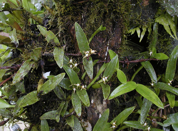 Found in Florida, Cuba, Dominican Republic, Haiti, Puerto Rico, Jamaica, Windward Islands, Trinidad & Tobago, Aruba, Bonaire, Curacao, Mexico, Guatemala, Belize, Honduras, Nicaragua, Costa Rica, Panama, Colombia, Venezuela, Guyana, Surinam, French Guiana, Brazil, Bolivia, Peru and Ecuador in wet montane forests at elevations of sealevel to 1700 meters as a common, miniature sized, hot to cool growing, creeping epiphyte with pseudobulbs that forms dense mats, that blooms mostly in the spring, summer and fall on a terminal, very short, subsessile, subumbellate inflorescence arising on a mature, fusiform, bifoliate, dark green pseudobulb carrying 2, narrowly lanceolate, acute, conduplicate at the base leaves subtended by two sheaths and forming a spathe usually occuring with one to two flowers held close to the apex of the pseudobulb.