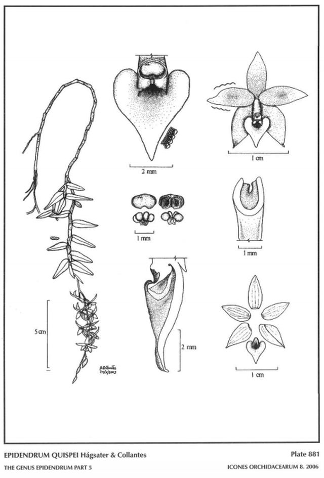 "Epidendrum quispei belongs to the monotypic GROUP Quispei which is characterized by the monopodial, branching habit, the new stems produced from a subapical internode of the previous stem, the lack of spathaceous bracts, wlth 1-2 bracts on the peduncle, racemose inflorescence, the flowers star-shaped, the petals somewhat narrower than the sepals, the lip deeply cordlform and acute. The species is recognized by the pendent plants, racemose inflorescence with 5 to 10 flowers, .32" [8 mm] long sepals, deeply cordiform lip wlthout calli, and the petals as wide as the sepals. Most other pendent Epidendrum species of this size have a spathaceous bract, and we have not found any species similar to this one. The plant habit is reminiscent of the Nanun Group, monopodial with the new stem produced from a subapical internode of the previous stem; however, the inflorescence is long and many-flowered, and the flowers are typically Epidendrum-like but somehow unique, with the deeply cordate, acute, ecallose lip." Hagsater etal 2006