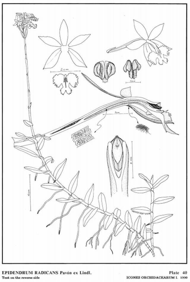 References W3 Tropicos, Kew Monocot list , IPNI ; Bonplandia Rchb.f 1856; Atlas des Orchidees Cultivees Constantin 1920 drawing fide; Repert. Sp. Nov. Regni. Veg. Beih. 17: 39. Panama Schlechter 1922 as E radicans var chiriquense; Repert. Sp. Nov. Regni. Veg. Beih. 19: 125. Costa Rica Schlechter 1923 as E pratense; The Genus Epidendrum Ames 1936; AOS Bulletin Vol 30 No 5 1961 drawing plant only; AOS Bulletin Vol 35 No 4 1966 photo; AOS Bulletin Vol 35 No 10 1966; Die Orchideen 3 Auflage Bd 1 Sonderabdruck aus Schlechter Lieferung 9 513 - 576 Brieger, Maatsch and Senghas 1977 drawing fide; Orquideologia Vol 12 No 1 1977; AOS Bulletin Vol 48 No 4 1979 photo fide; Orquídea (Mexico City), n.s., 7[3]: 1979; Icones Planetarum Tropicarum plate 731 Dodson 1982 drawing fide; Selbyana Vol 10 Orchids of Central America Hamer 1988 drawing fide; Icones Orchidacearum I Plate 40 Hagsater and Salazar 1990 drawing fide; Native Colombian Orchids Vol 2 COS 1991 photo fide; The Illustrated Encyclopedia of Orchids Pridgeon 1992 photo fide; AOS Bulletin Vol 62 No 5 1993 photo fide; Icones Planetarum Tropicarum plate 1433 Atwood 1993 drawing fide; Icones Planetarum Tropicarum plate 1520 Atwood 1993 see notes; AOS Bulletin Vol 63 No 3 1994 photo fide; An Orchid Flora Of Puerto Rico and the Virgin Islands Ackerman 1995; Orchid Digest Vol 62 #1 1998 photo fide; AOS Bulletin Vol 67 No 9 1998 photo fide; Guatemala Y Sus Orquideas Behar & Tinschert 1998 photo fide; Orchidaceae Antillanae Nir 2000; Manual de las Plantas de Costa Rica Vol 3 Hammel, Grayum, Herrera and Zamora 2003 drawing fide; The Orchids of Cuba Llamacho & Larramendi 2005 photo fide; Orchids of Mexico Hagsater, Soto, Salazar, Jimenez, Lopez and Dressler 2005 photo fide; AOS Bulletin Vol 75 No 2 2006 photo fide; Icones Orchidacearum Vol 11 Plate 1104 Hagsater & Sanchez 2008 See recognition section; Icones Orchidacearum Vol 11 Plate 1105 Hagsater & Sanchez 2008 see recognition section; Icones Orchidacearum Vol 11 Plate 1125 Hagsater & Sanchez 2008 see recognition section; Icones Orchidacearum Vol 11 Plate 1130 Hagsater & Sanchez 2008 see recognition; Icones Orchidacearum Vol 11 Plate 1171 2008see recognition section Hagsater & Sanchez 2008; Orchid Species of Peru Zelenko Bermudez 2009 photo fide; Orchids of Costa Rica Vol 1 Morales 2009 photo fide; Orchid Digest Vol 75 #1 2011 photo fide; Las Orquideas del Peru Izerskyy & Bezverhov 2011 photo fide; Orchid Digest Vol 76 #2 2012 photo fide; AOS Bulletin Vol 82 #10 2013 photo fide; Le Petit Larousse des Orquidees Lecoufle, Barthelemy and Schmidt 2013 photo fide; Orchids of the Department of Valle De Cauca Colombia Vol 2 Kolanowska, Hagsater etal. 2014 photo drawing/photo fide; Guia de Orquideas de Chiapas Carlos Rommel Beutelspacher Baigts 2013 photo fide; Orchid Flora of the Greater Antilles Ackerman 2014; Orchids of Tropical America Meisel 2014 photo fide; Orchid Digest Vol 81 #1 2017 photo fide; Orquideas, Tesoro de Colombia Vol 2 Ortiz & Uribe 2017 drawing/photo fide; Orchid Genera and Species in Guatemala Archila, Szlachchetko, Chiron, Lipinska, Mystkowska and Bertolini 2018; Orchid Genera and Species in Guatemala Archila, Szlachchetko, Chiron, Lipinska, Mystkowska and Bertolini 2018 as E radican f aurantiacum; Orchid Genera and Species in Guatemala Archila, Szlachchetko, Chiron, Lipinska, Mystkowska and Bertolini 2018 as E radicans f aureum; Icones Orchidacearum 17(1) Plate 1790 Hagsater & Jimenez 2019 see recognition section; Lankesteriana 19(1). 31 - 55 2019 photo fide; Orquideas de Farallones de Cali Galindo-Tarazona, Haelterman, Zuluaga Trochez and Sebastian Moreno 2020 photo fide
