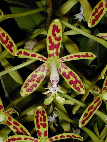 "E. raniferum Lindl., belongs to the GROUP Cristatum SUBGROUP Cristatum and is recognized by the large caespitose plant, many-leaved, terete stems with lanceolate, acute leaves, the 2 to 2.8" [5 to 7 cm] long, conduplicate, imbricating sheaths, the apex rounded, with a short, compact, nutant raceme of pale green flowers, the sepals and petals marked with large spots of reddish-purple, the column and lip white lightly tinged with purple and the lip with a small, entire midlobe but this species has the lateral-lobes of the lip deeply lacerate and the midlobe bifid. Epidendrum tziscaoense as herbarium specimens, the flowers dry black, and has very short, compact racemes, the flowers with entire lobes of the lip. In shape the flowers are very similar to E. cnemidophorum which has yellow sepals and petals spotted with reddish-brown, and the column and lip are rose-magenta, the callus white, the midlobe of the lip is widened at the apex to short-bifid, blunt lobes, flowers are usually larger, sepals being .6 to .92" [15 to 23 mm] long. Epidendrum pfavii Rolfe has clear magenta flowers with the disc white, entire lateral lobes and a bifid midlobe, floral bracts are long-acuminate." Adapted from Epidendrum tziscaoense Plate 391 Hagsater 1999