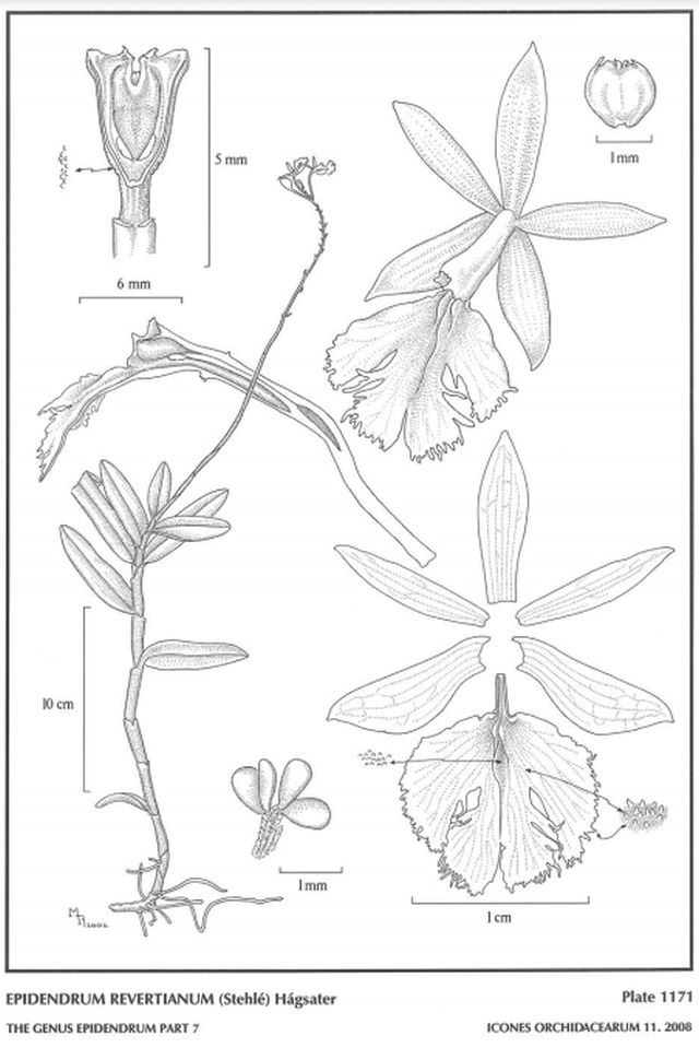 References W3 Tropicos, Kew Monocot list , IPNI ; Flore Descriptive des Antilles Francaises H. Stehle 1939 as E calanthum var revertianum drawing fide; *Orquídea (Méx.) 13(1-2): 215-218.Hagsater 1993; Orchidaceae Antillanae Nir 2000; Icones Orchidacearum Vol 11 Plate 1171 Hagsater & Sanchez 2008 drawing fide; Orquideas, Tesoro de Colombia Vol 2 Ortiz & Uribe 2017; Icones Orchidacearum 17(1) Plate 1715 Hagsater & Jimenez 2019 see recognintion section Icones Orchidacearum 17(1) Plate 1717 Hagsater & Jimenez 2019 see recognintion section
