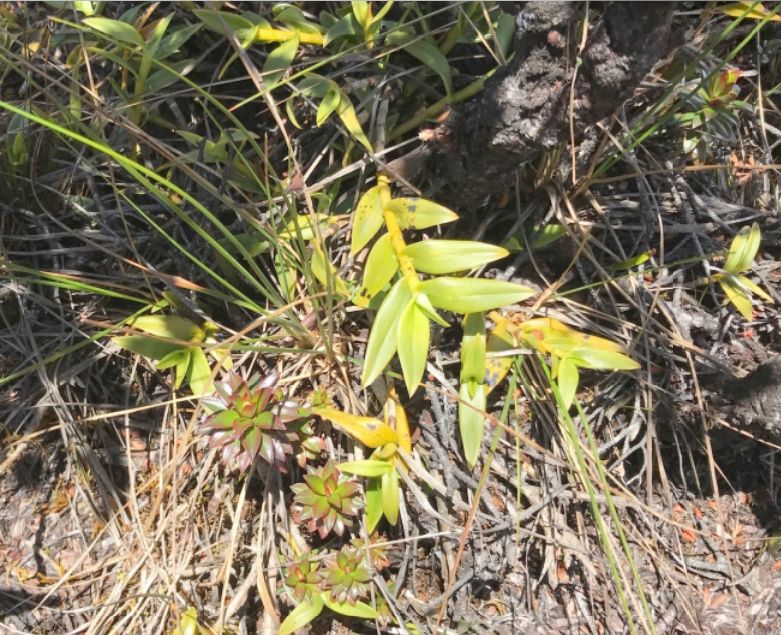 Found in Venezuela, Guyana and Brazil from the summit of the higher Tepuis in the Guiana Shield and south to the Cerro Marahuaca among Bonnetia roraimae shrubs at elevations of 2250 to 2800 meters as a small to medium sized, cold growing terrestrial with cane-like, rarely branching when mature, terete, prostrate, decumbent, the primary stem ca. 8.04 to 16" x .16 to .24" [21 to 40 x 0.4 to 0.6 cm]; the branches 2.6 to 6" x .08 to .12" [6.5 to 15 x 0.2 to 0.3 cm]; the stem base covered by non-foliar tubular, scarious sheaths carrying 5 to 10 on the main stem, 3 on the branches, distributed along the apical 1/3 of the stems, articulate, distichous, sub-coriaceous, sub-spreading with respect to the stem, similar in size and shape, light yellowish green, with a tubular, rugose, striated basal sheath; blade lanceolate, acute to sub-acuminate, apical margin denticulate, revolute leaves that blooms in the spring on a terminal, without a spathe, peduncle .4 to .6" [1.0 to 1.5 cm] long, terete, thin; rachis 1 to 1.6" [2.5 to 4.0 cm] long, straight, 1.4 to 2" [3.5 to 5.0 cm] long overall, apical, flowering only once, erect to slightly arching, racemose, laxly, successsively from the base towards the apex of the inflorescence, 6 to 8 flowered, though several are open at the same time inflorescence with not spreading, prominent, longer than the ovary, cucullate, widely ovate when spread, acute, fleshy, at a right angle with respect to the rachis floral bracts and carrying . small, non-resupinate, white to yellowish white flowers without fragrance data and with the lip always facing the rachis.